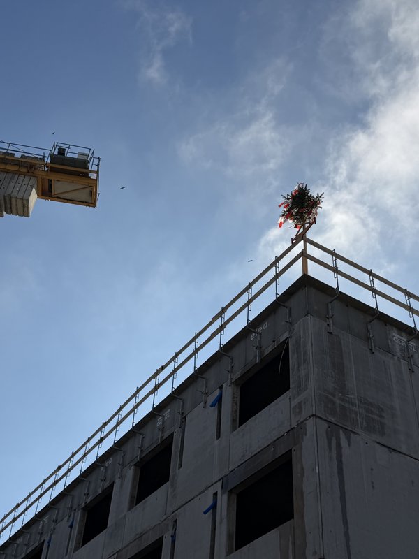 Wie es sich für eine Gleichenfeier gehört, wurde der Richtbaum auf dem Dach befestigt und mit den anwesenden Fachkräften, MitarbeiterInnen, BewohnerInnen und Ehrengästen gebührend gefeiert.