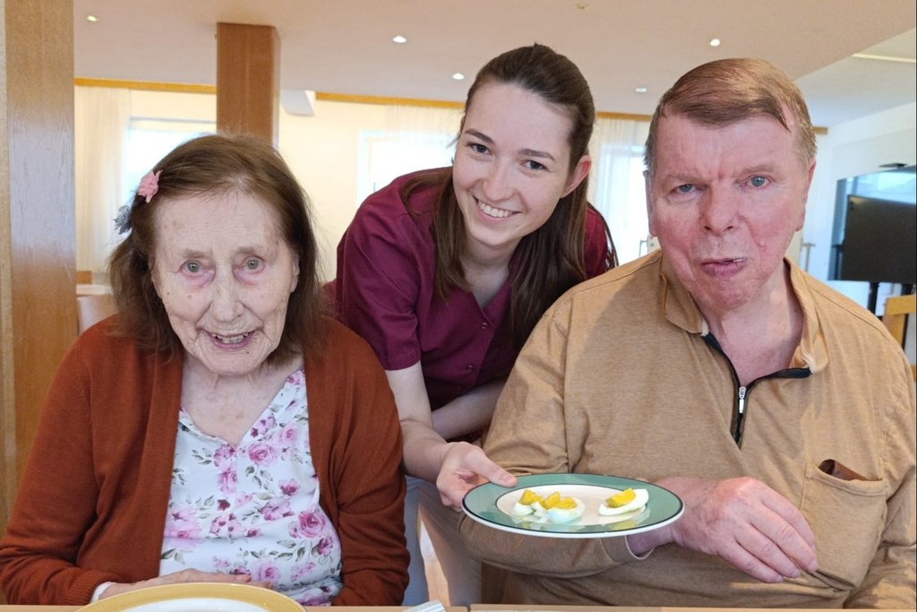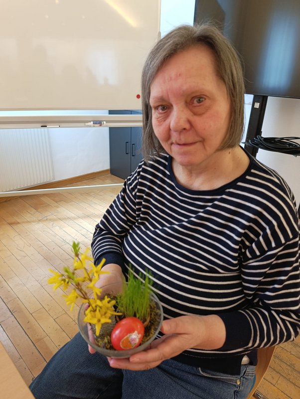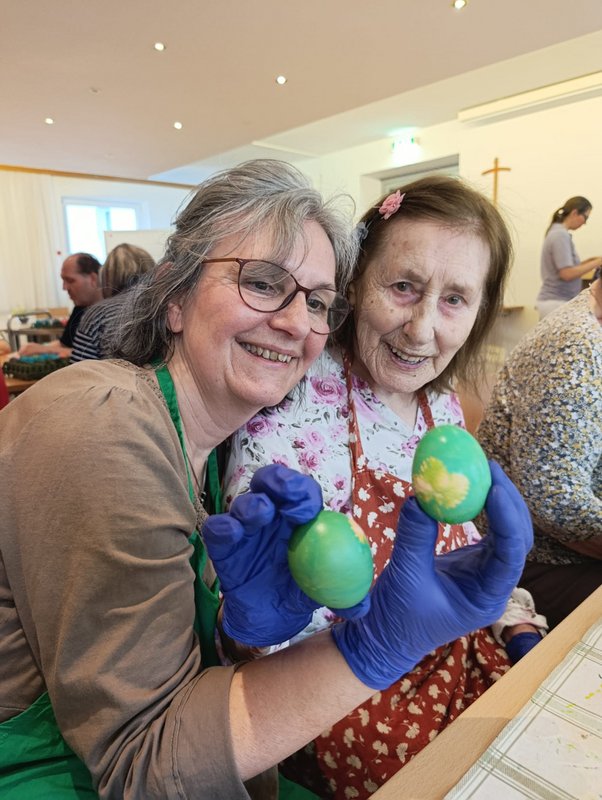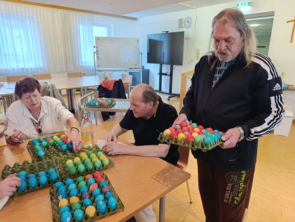 Am Gründonnerstag wurden von den BewohnerInnen im LPBZ Christkindl im Rahmen der Ergotherapie 210 Eier bunt gefärbt und verziert: mit Begeisterung, Kreativität und einem großen Repertoire an Fähigkeiten wie Handlungsplan und Feinmotorik. Auch die richtige Dosierung der Kraft in den Händen ist wichtig, damit die Eier ins Osternesterl kommen. Denn wenn man nicht sanft genug ist, brechen sie und diese Eier werden dann gleich gegessen!