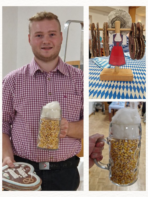 Fixtermin im Jahreskalender ist das Oktoberfest. In den LPBZ Schloss Haus und Christkindl wurde in den blau-weiß geschmückten Festsälen gelacht, getanzt und geschunkelt. Und in Christkindl waren erfreulicherweise auch BewohnerInnen aus dem LPBZ Schloss Cumberland mit von der Partie und genossen Kaffee und Mehlspeisen. Die MitarbeiterInnen des PSD bastelten schon Tage vorher mit den BewohnerInnen die passende Tischdeko. In Schloss Haus musste bei einem Schätzspiel die Anzahl der Maiskörner im Bierkrug so gut wie möglich erraten werden. Kaum zu glauben, dass über 2500 Körner im Krug Platz gefunden haben. Die drei Besten bekamen ein Lebkuchenherz als Preis. Weißwürste und Brezn durften natürlich beim Oktoberfest nicht fehlen. Die waren aber so schnell aufgegessen, dass sie es nicht mehr auf ein Foto geschafft haben.