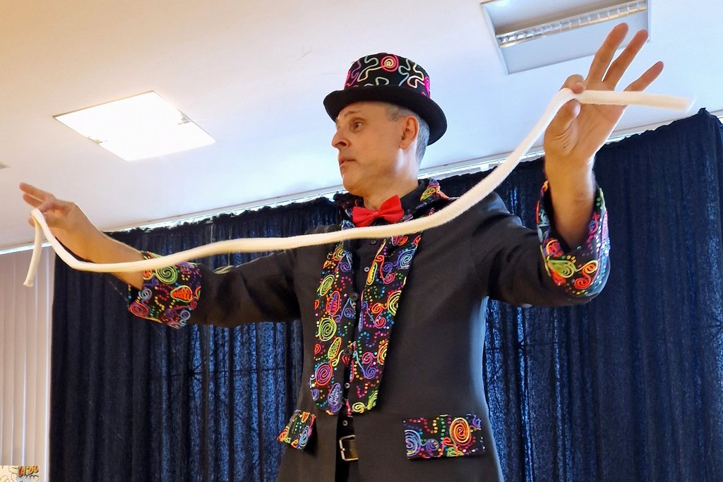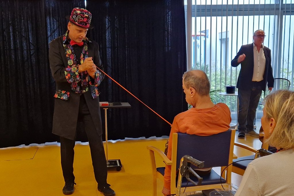 Die ZuschauerInnen im LPBZ Christkindl tauchten vollends in das Reich des Unmöglichen ein, um für eine Stunde zu staunen und den Alltag zu vergessen. Verblüfft beobachteten sie die Vorführung der vier Magier des 1. Linzer Zaubertheaters. Ob Kartentricks direkt vor ihren Augen, zerschnittene Seile, erscheinende Weinflaschen oder Luftballontiere – geboten wurde die gesamte Palette der magischen Künste. Der Besuch der Zauberer wird den BewohnerInnen – allen voran den mitwirkenden Assistentinnen auf der Bühne – noch lange in freudiger Erinnerung bleiben.